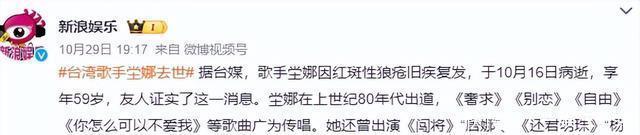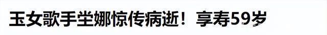 然而这才仅仅过去了两天的时间,就在29号晚上,59岁台湾歌手坣娜离世的消息,更是让人震惊不已。