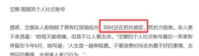 两种绝症集于一身,很难想象坣娜受到的折磨到底有多痛。 可当看到坣娜的最后遗言时,直接让人泪崩。 最后遗言暴露心迹网友泪崩:原来她早有预感 翻出坣娜6月8日最后一条动态,现在看每句话都让人泪目。 人生是一趟单程票,不要浪费时间执着不好的事,去想坏的事,去做害人害己的行为。